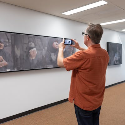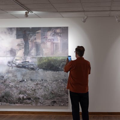 Inescapable Truths, includes 20 oil paintings created in McCallum’s signature style; layering photographic silk scrims over oil paintings. The silk envelopes the painting and subtly obscures the image depicted on the canvas. Additional works use photographic silk panels to activate testimony by Diane Foley, Jim’s mother using augmented reality.
