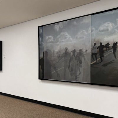 Inescapable Truths is about conflict, journalism, storytelling, humanity. McCallum uses oil painting and printing on silk to present a unique set of images that are simultaneously Foley’s and his own. The process is unmistakably McCallum’s; developed over years of making political art focused on re-centering stories of marginalization. His practice is one that highlights voices that are often ignored from within stories that we are so used to hearing. Because it takes effort to discern which part of the image is painted and which is printed, his paintings alter our perceptions and expectations. Some of the works seem to draw us in, while others seem to push us away. The experience is disorienting and engrossing all at once; it is hard to know where to look, and hard to look away.