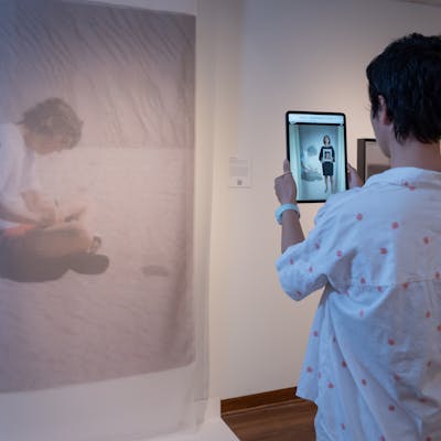 oil on linen, toner on silk, with augmented reality video