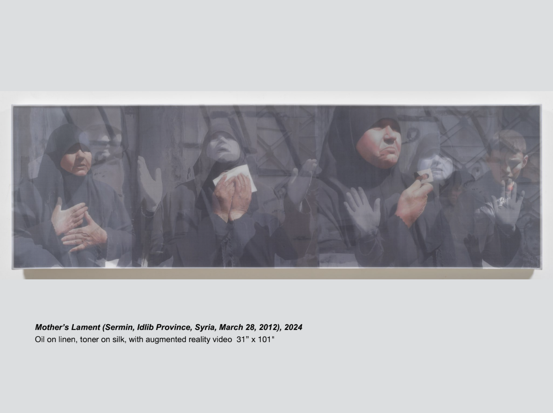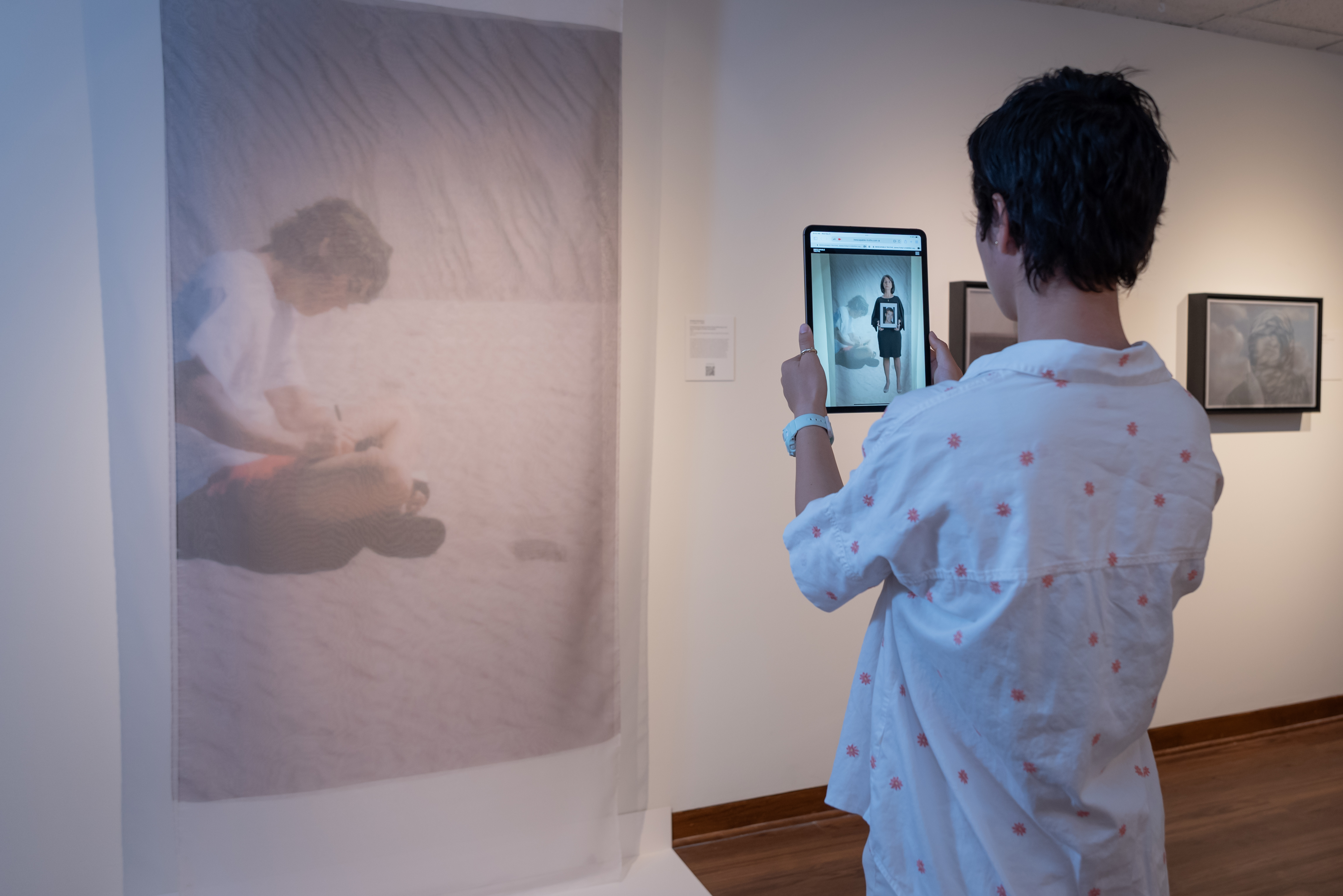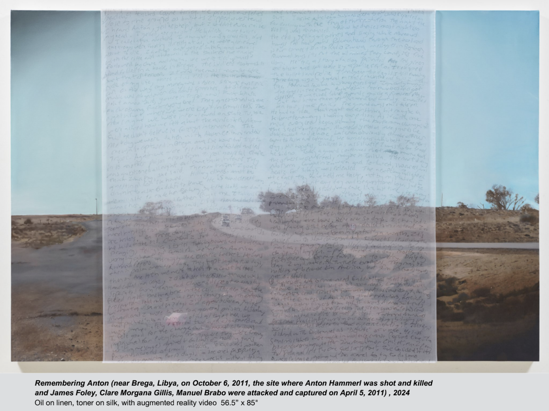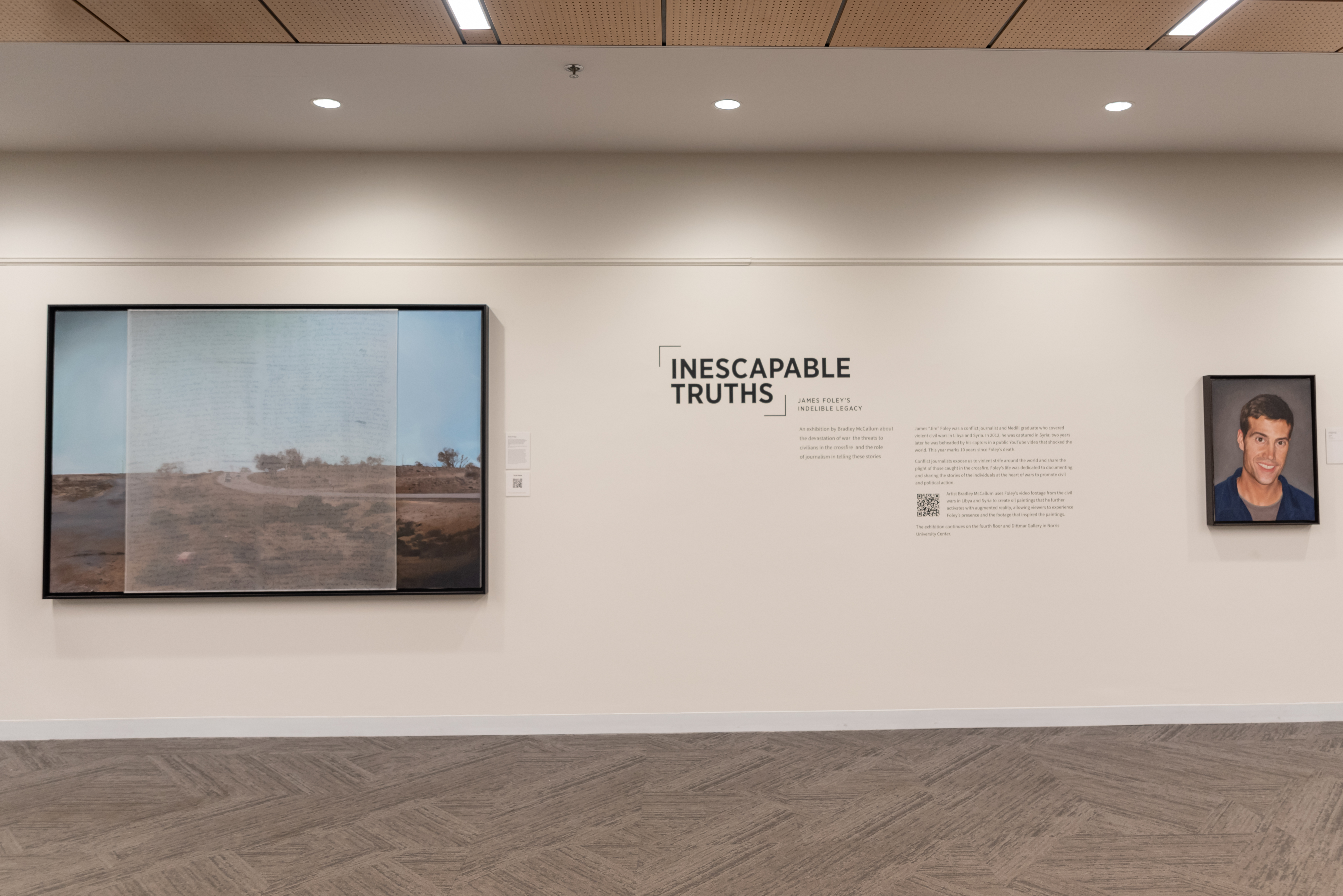 Inescapable Truths, includes 20 oil paintings created in McCallum’s signature style; layering photographic silk scrims over oil paintings. The silk envelopes the painting and subtly obscures the image depicted on the canvas. Additional works use photographic silk panels to activate testimony by Diane Foley, Jim’s mother using augmented reality.