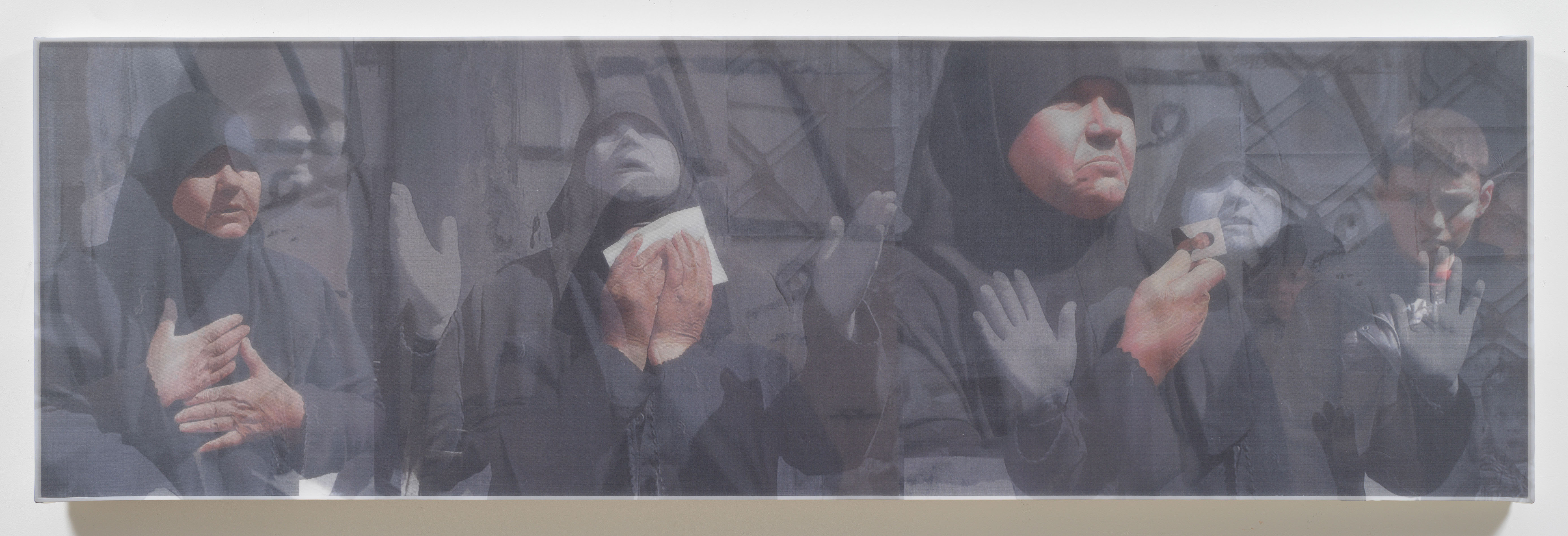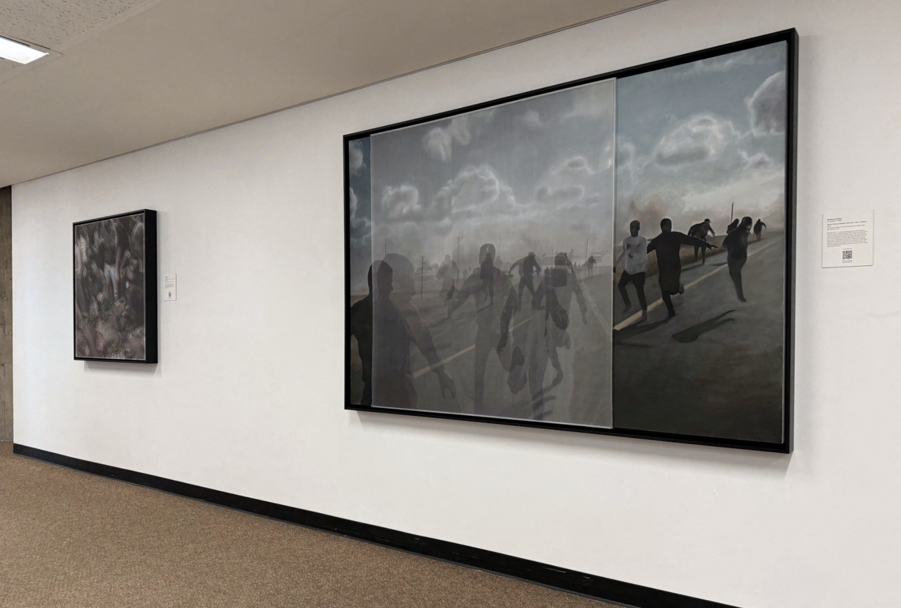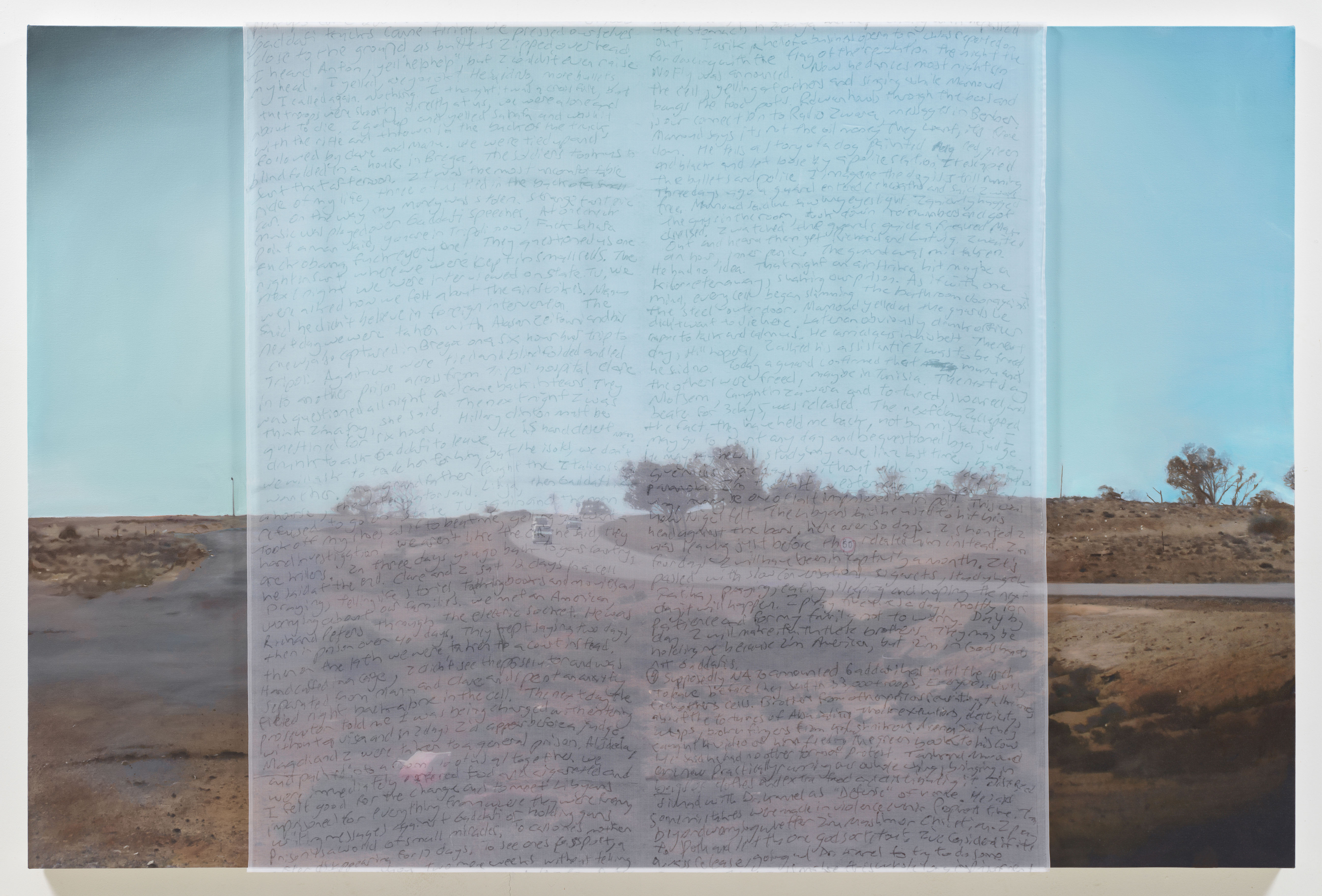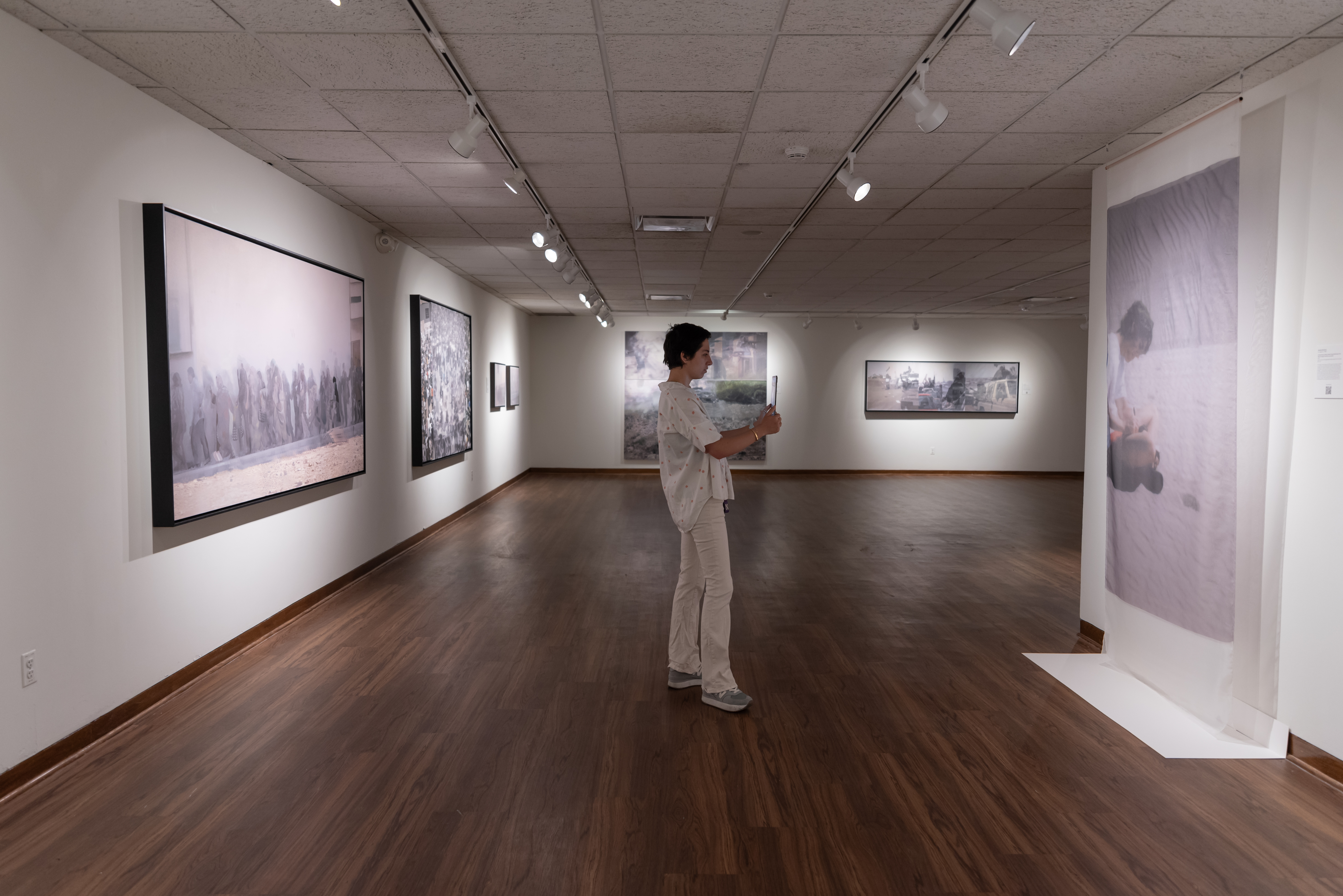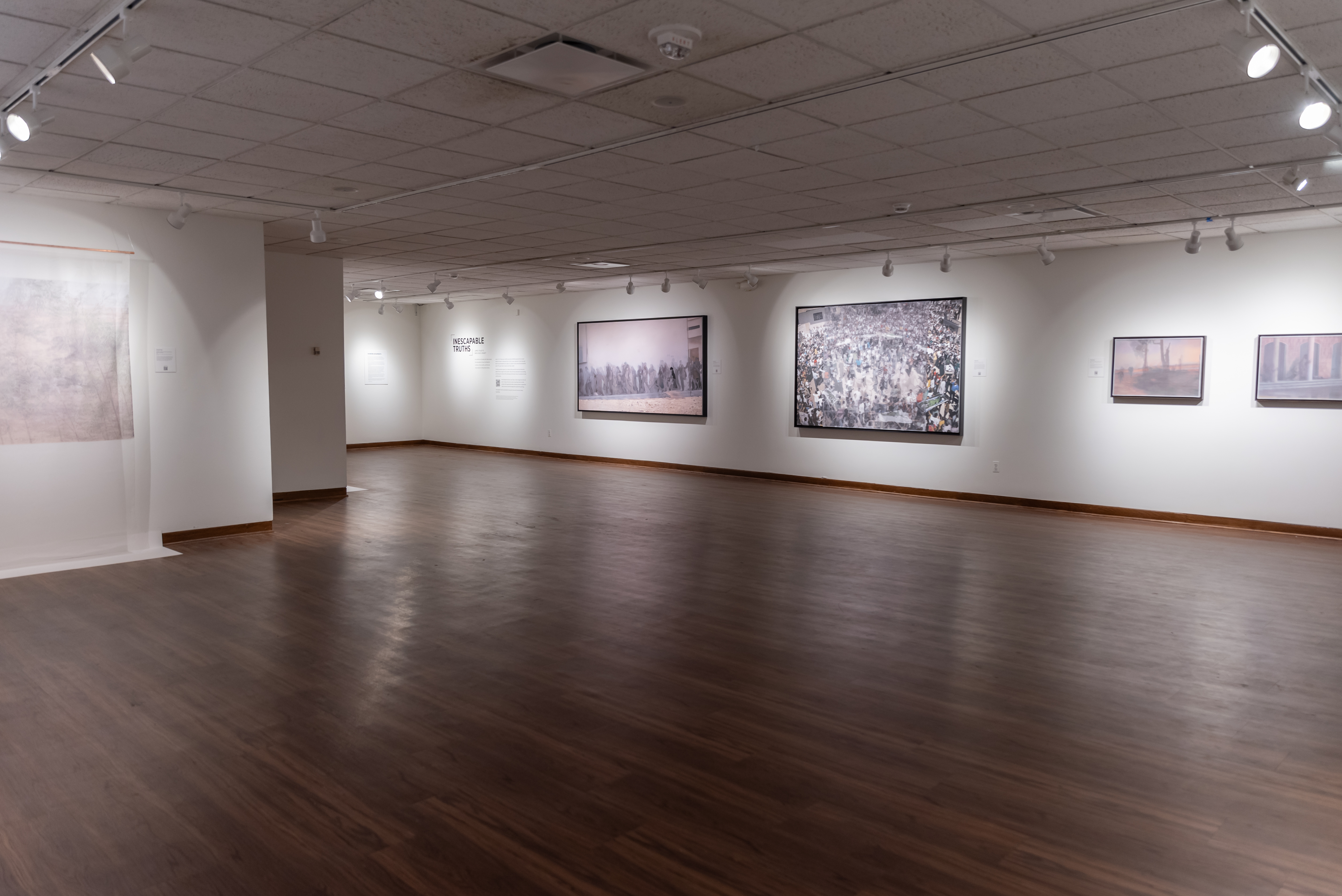 Inescapable Truths, includes 20 oil paintings created in McCallum’s signature style; layering photographic silk scrims over oil paintings. The silk envelopes the painting and subtly obscures the image depicted on the canvas. Additional works use photographic silk panels to activate testimony by Diane Foley, Jim’s mother using augmented reality.