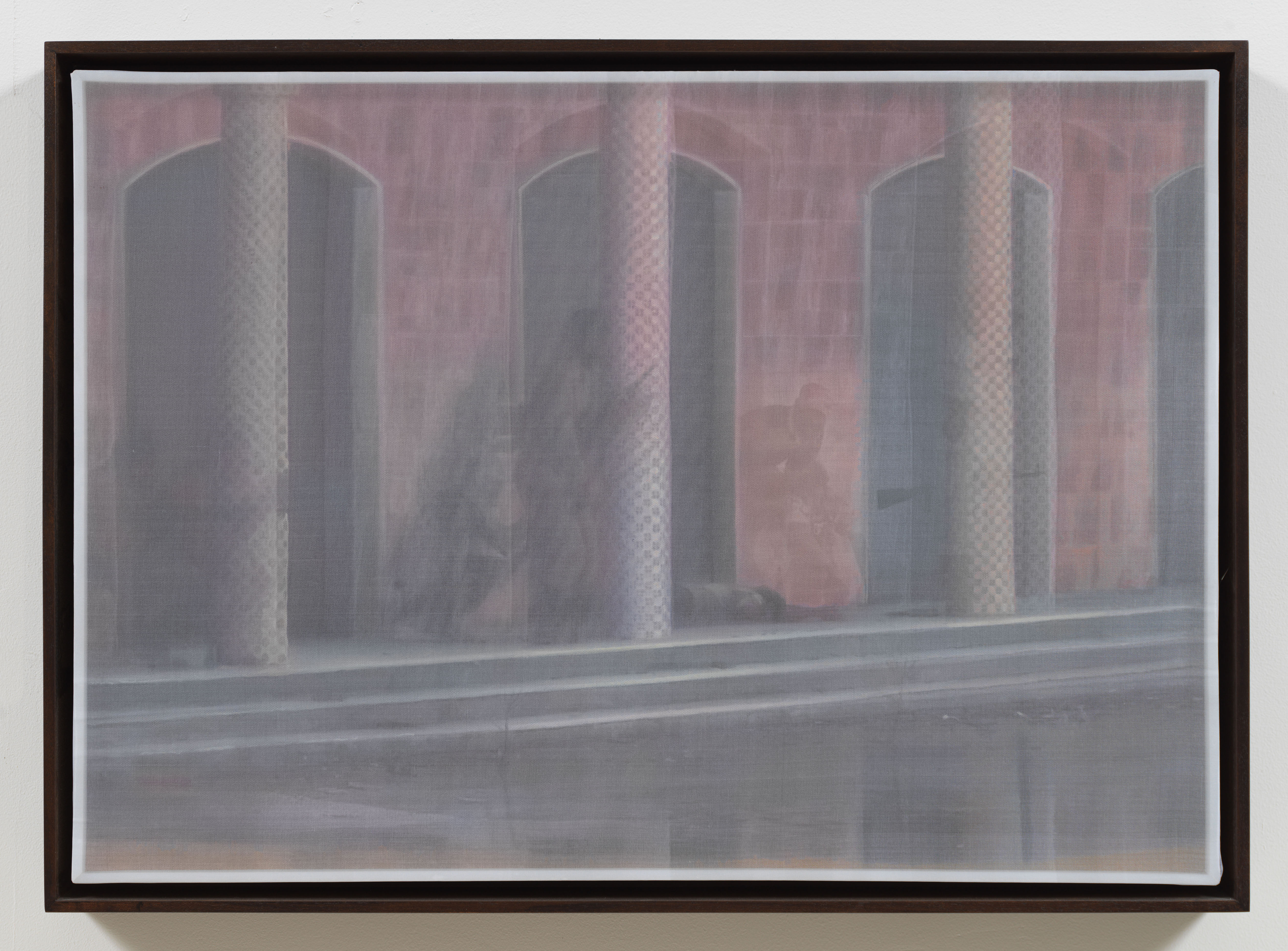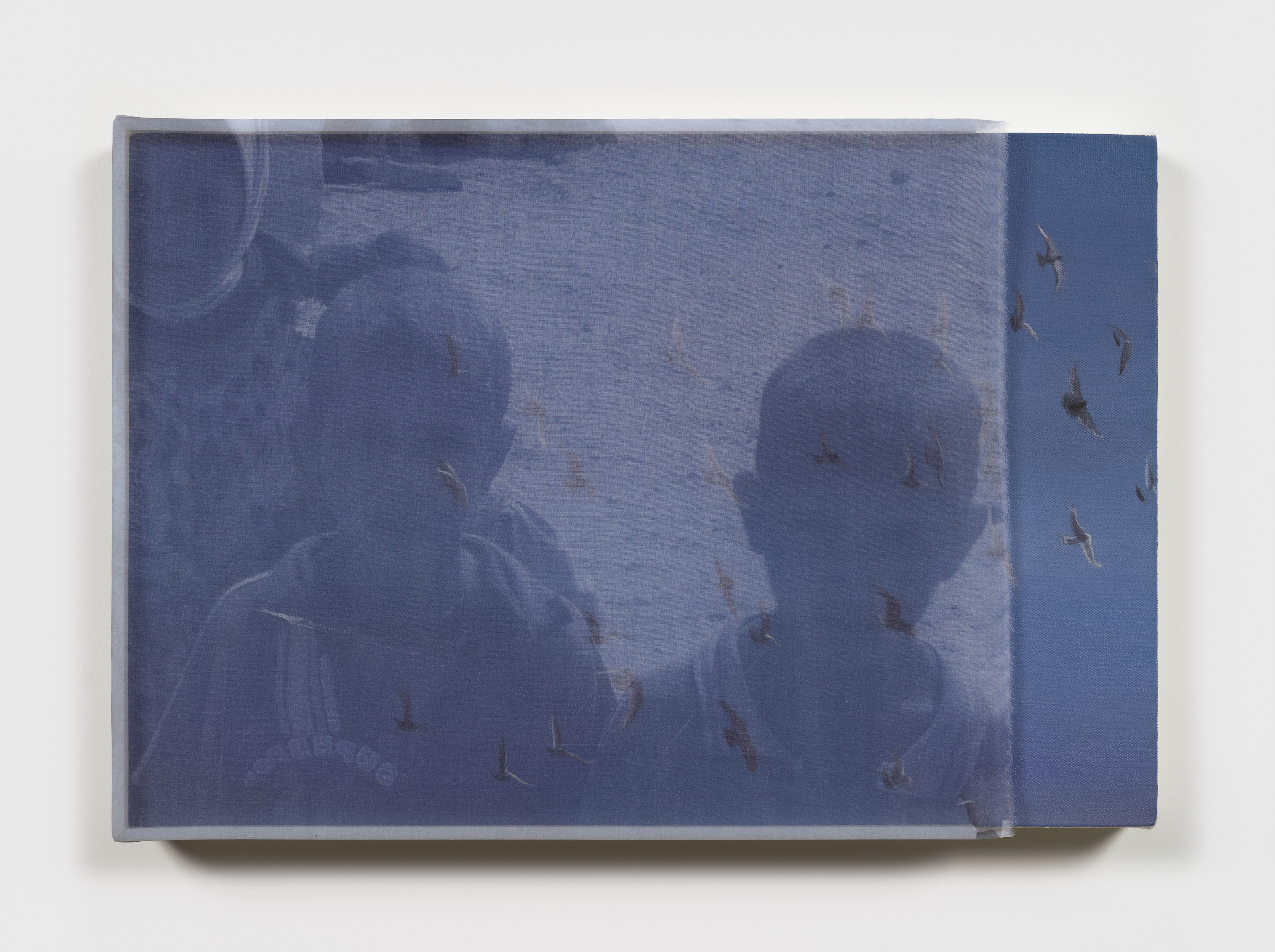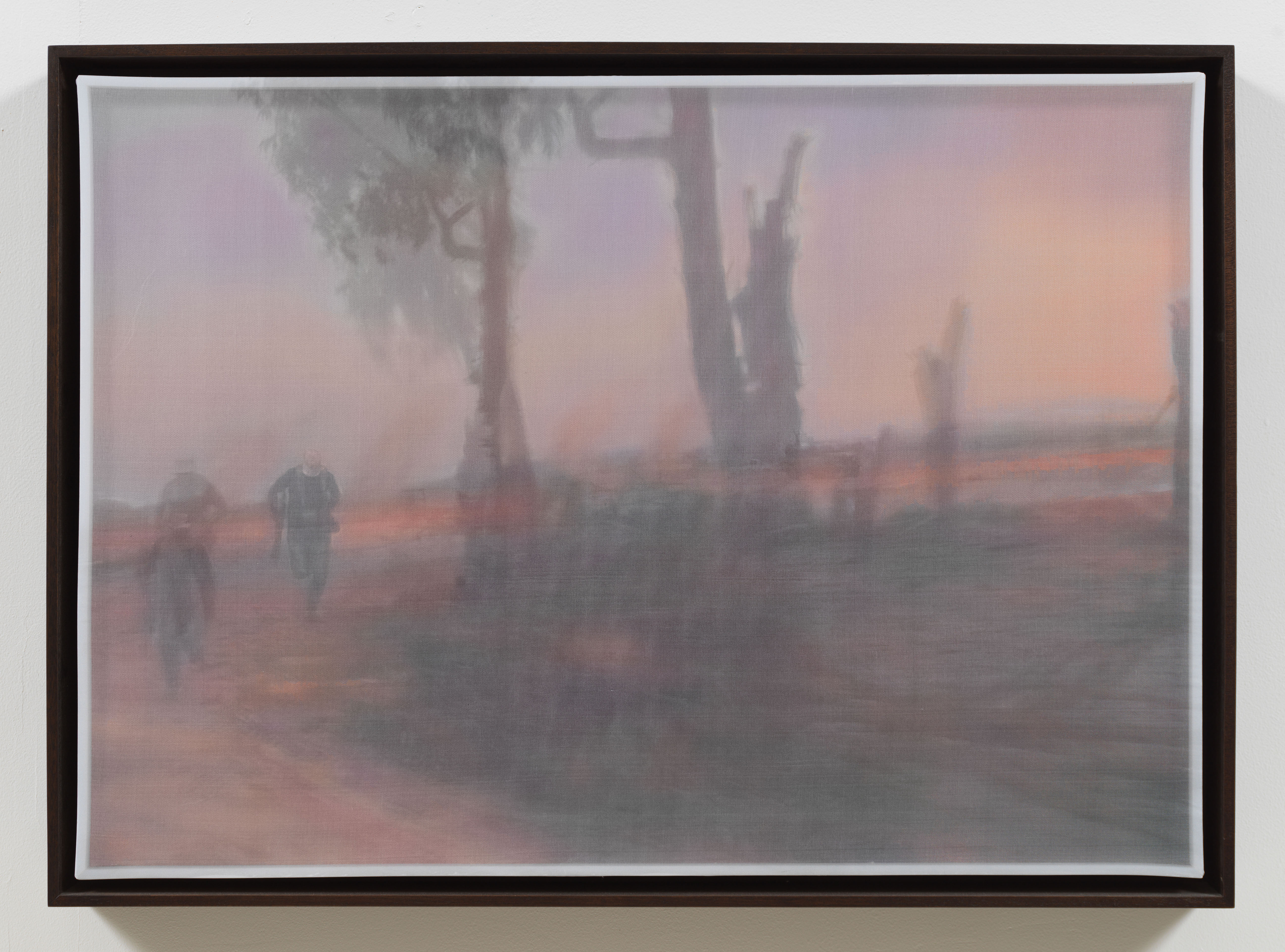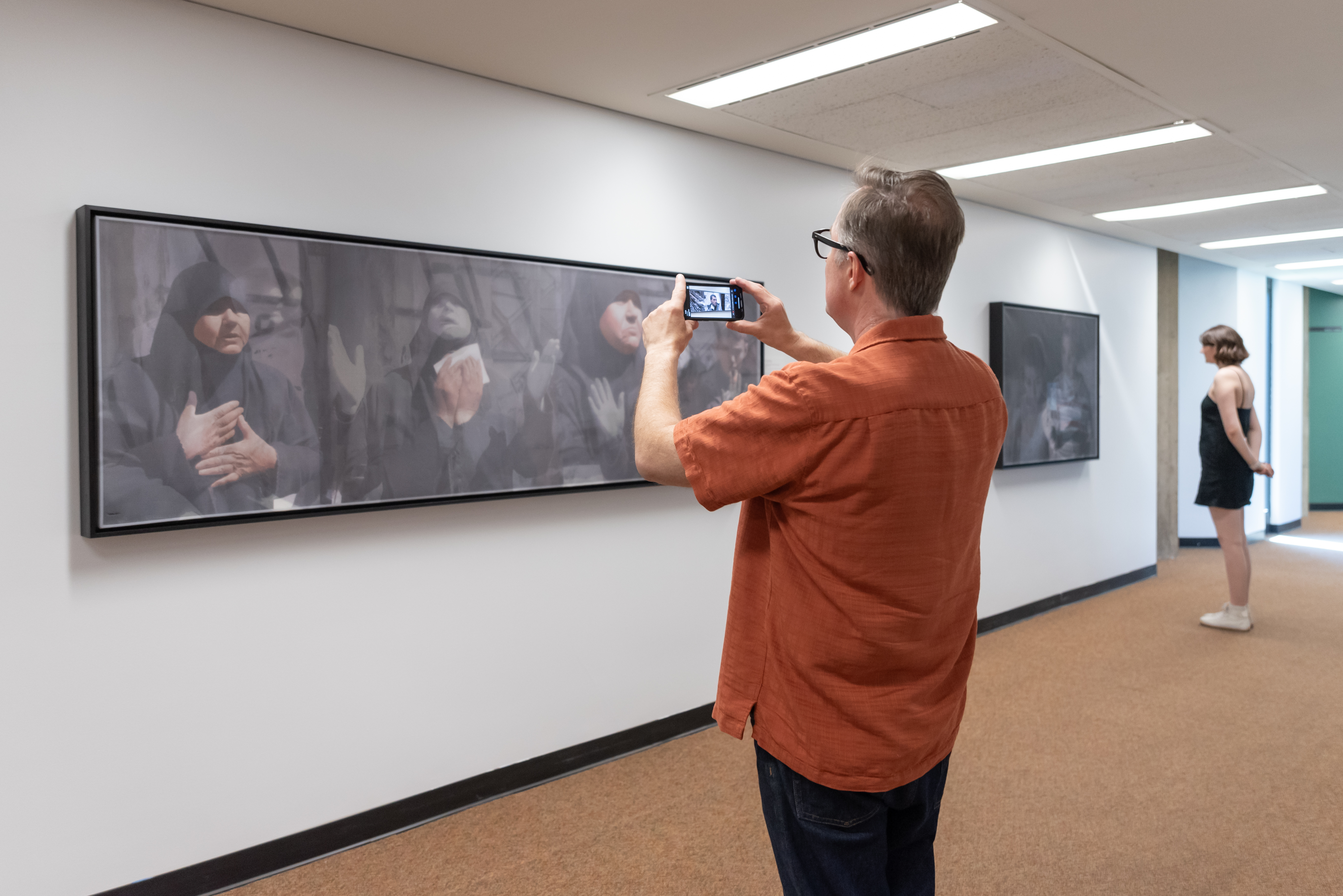 Inescapable Truths, includes 20 oil paintings created in McCallum’s signature style; layering photographic silk scrims over oil paintings. The silk envelopes the painting and subtly obscures the image depicted on the canvas. Additional works use photographic silk panels to activate testimony by Diane Foley, Jim’s mother using augmented reality.