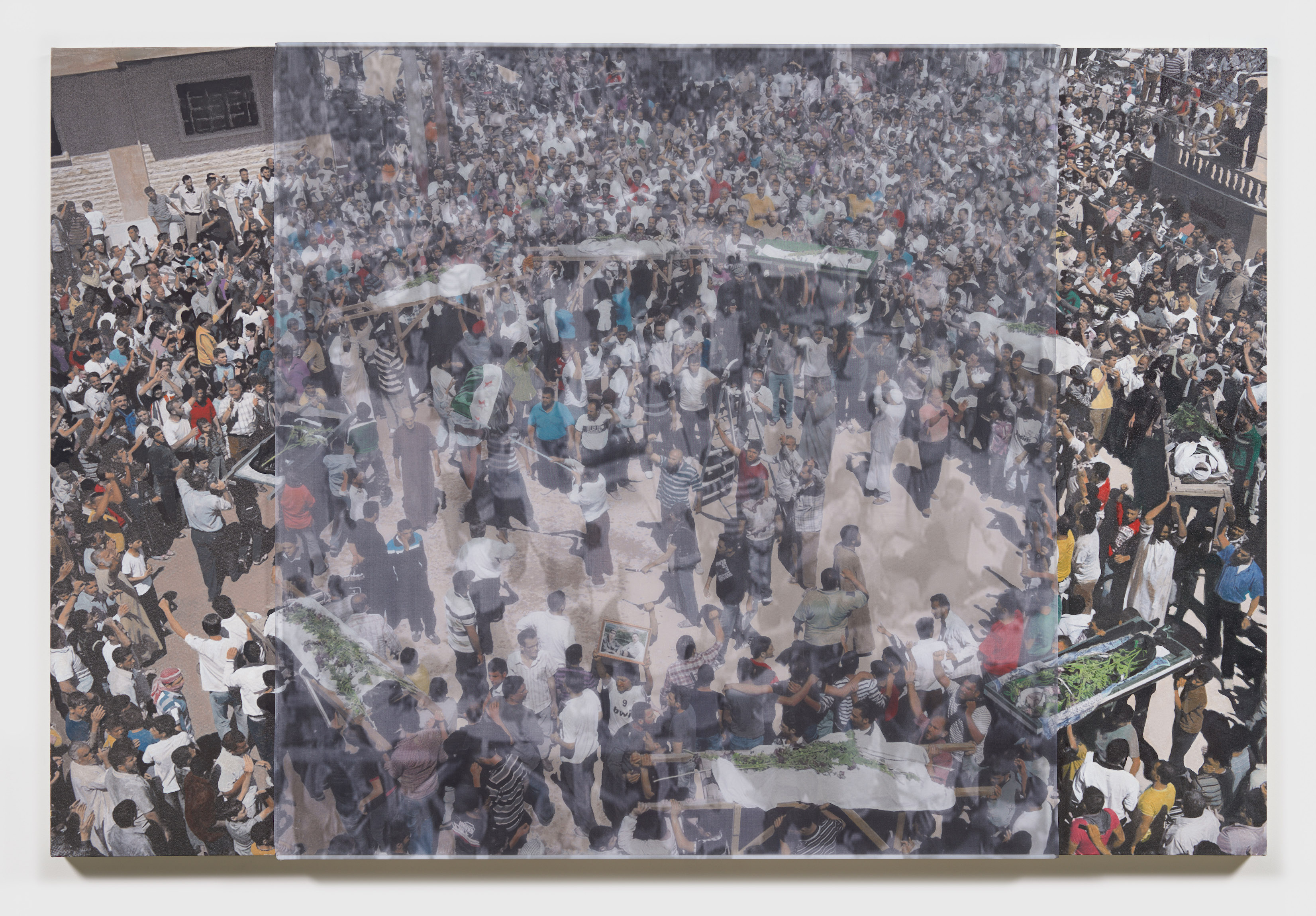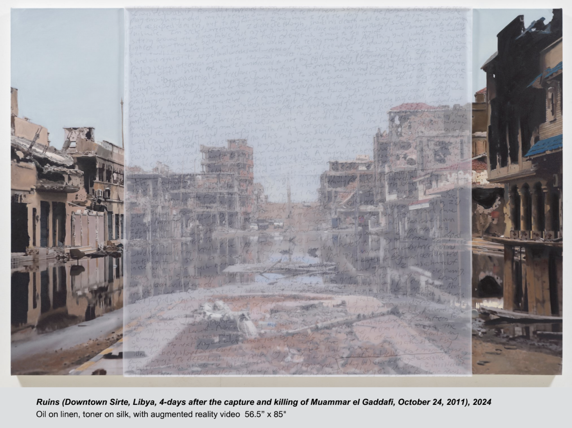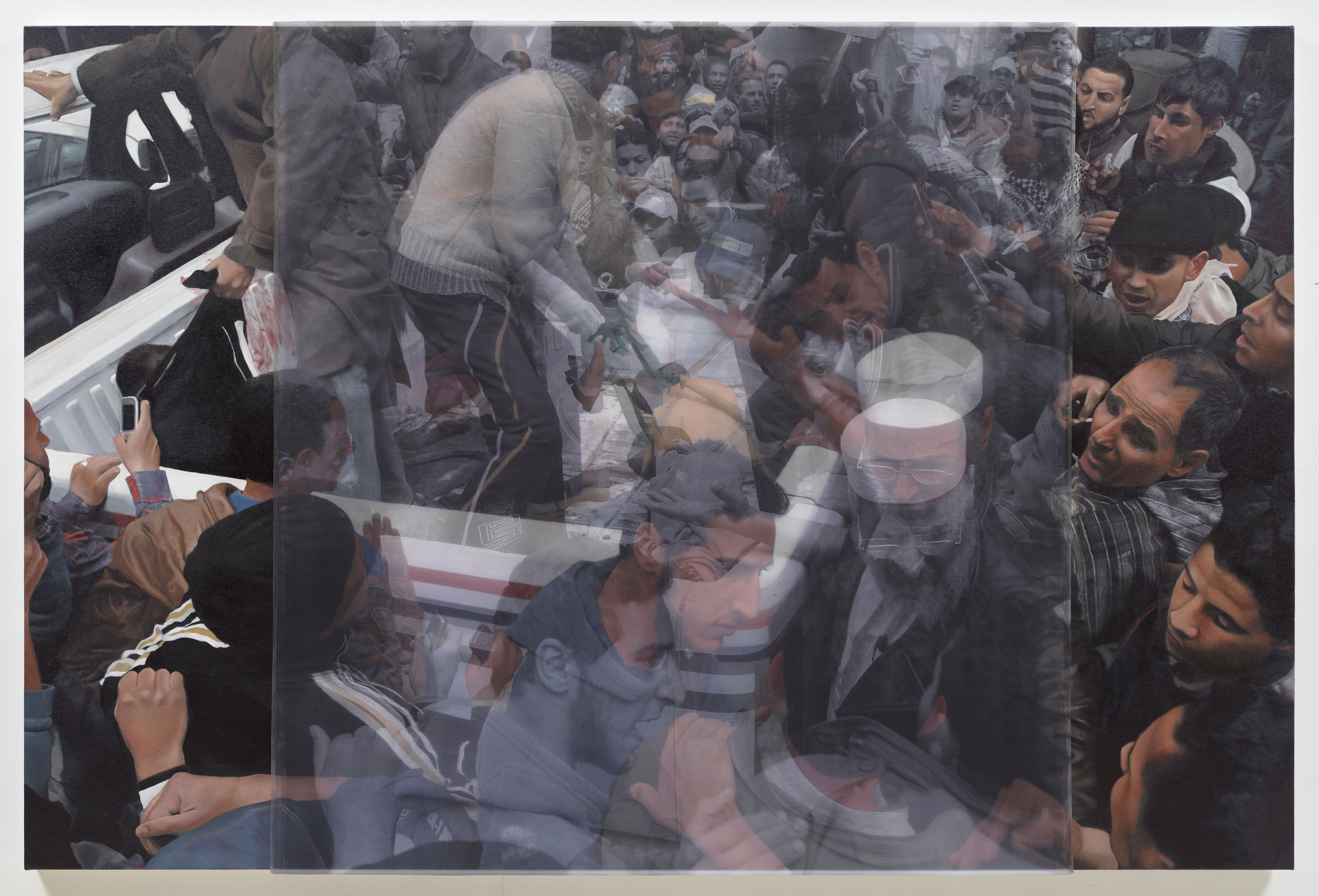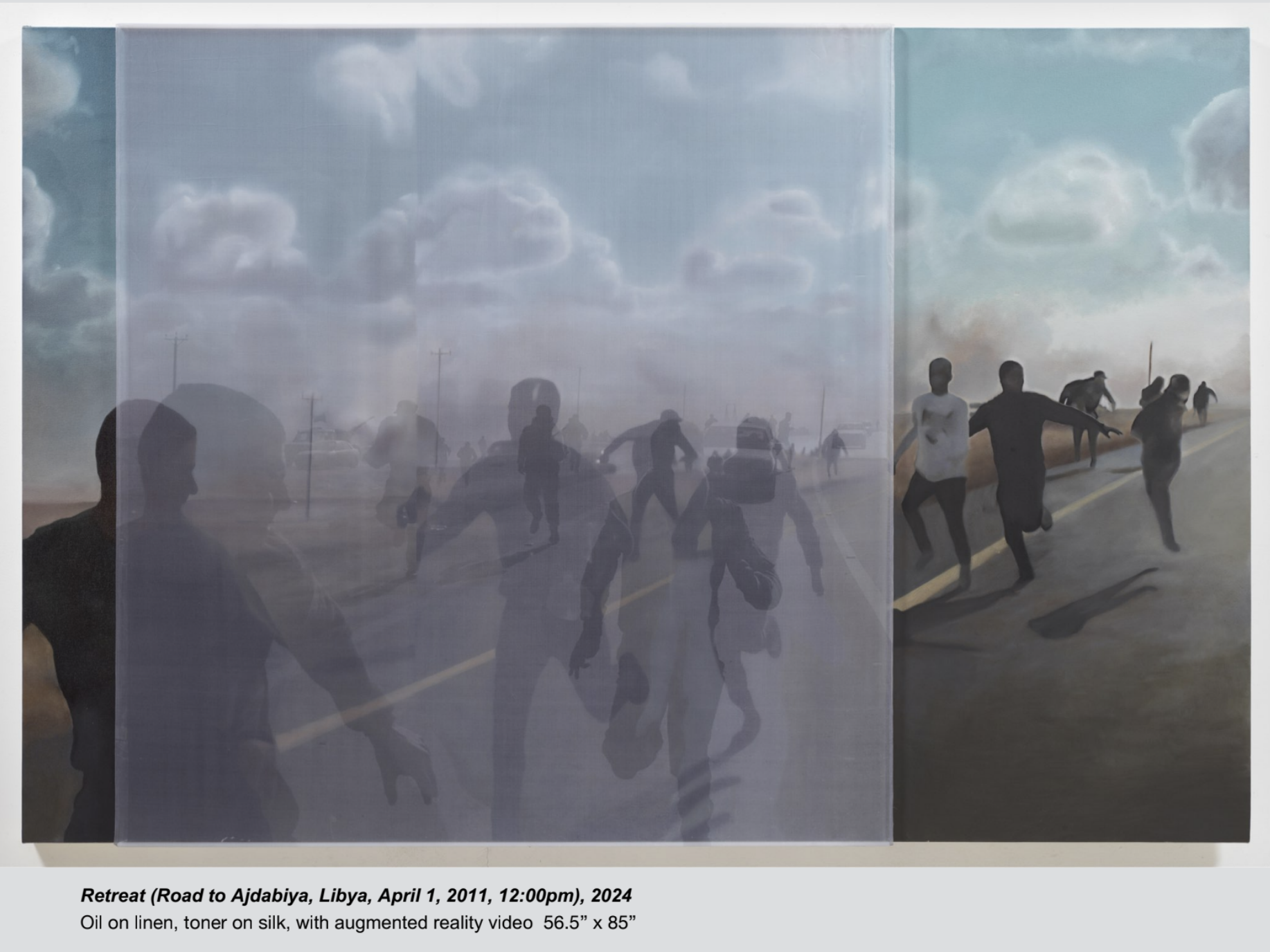 Early in the Libyan Arab Spring, the fighting was sporadic and chaotic. During one such violent incident, Foley recorded still photos and video of a field ambulance returning from the front with two casualties. In the AR video, the victims are bloody and you can hear Jim confirming if they are Benghazi civilians. The silk overlay captures two frames of this scene, diffusing the brutality of the moment and encapsulating the hectic, disorganized turmoil of the early fighting.