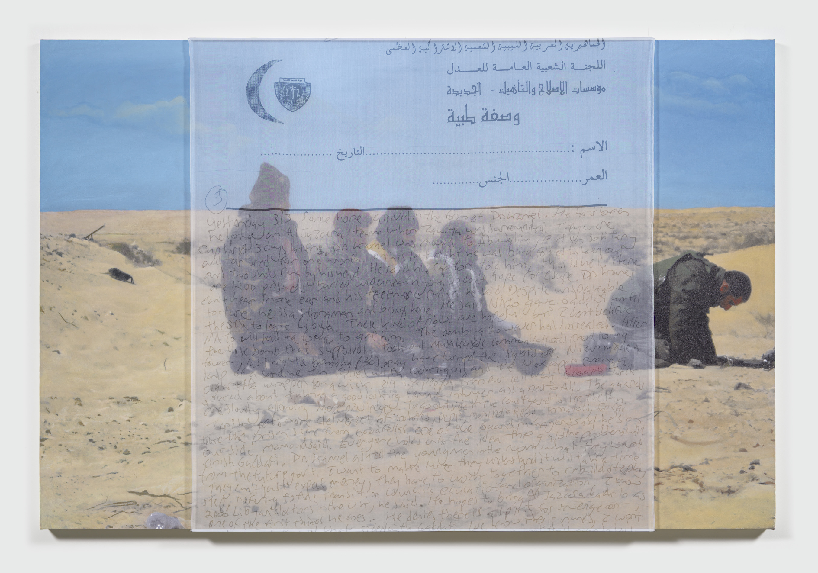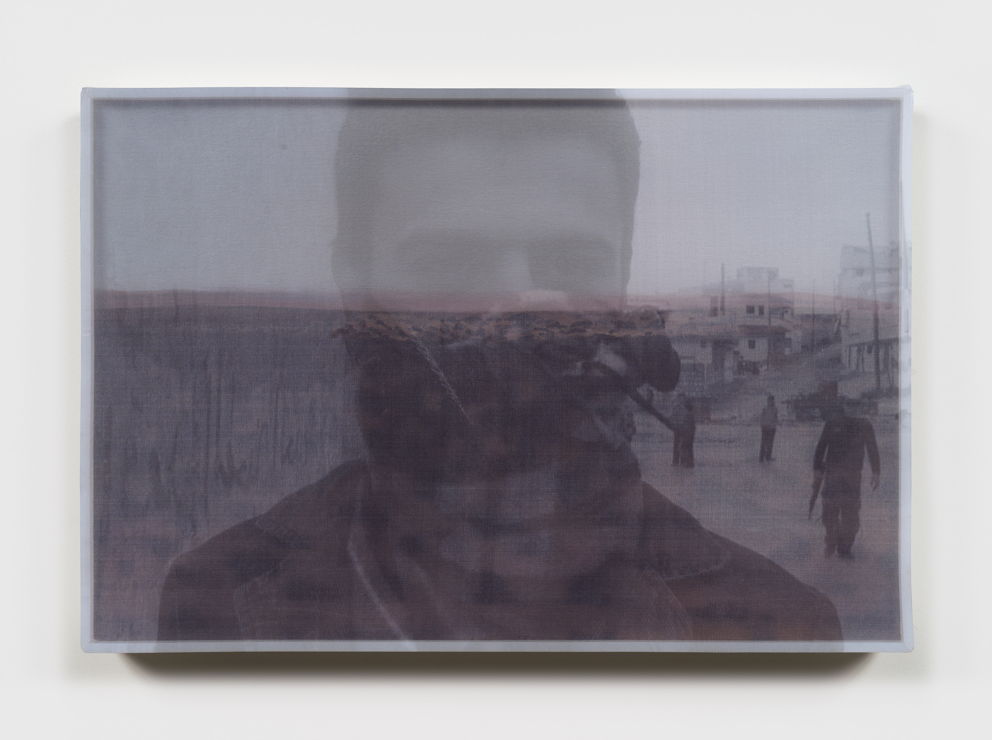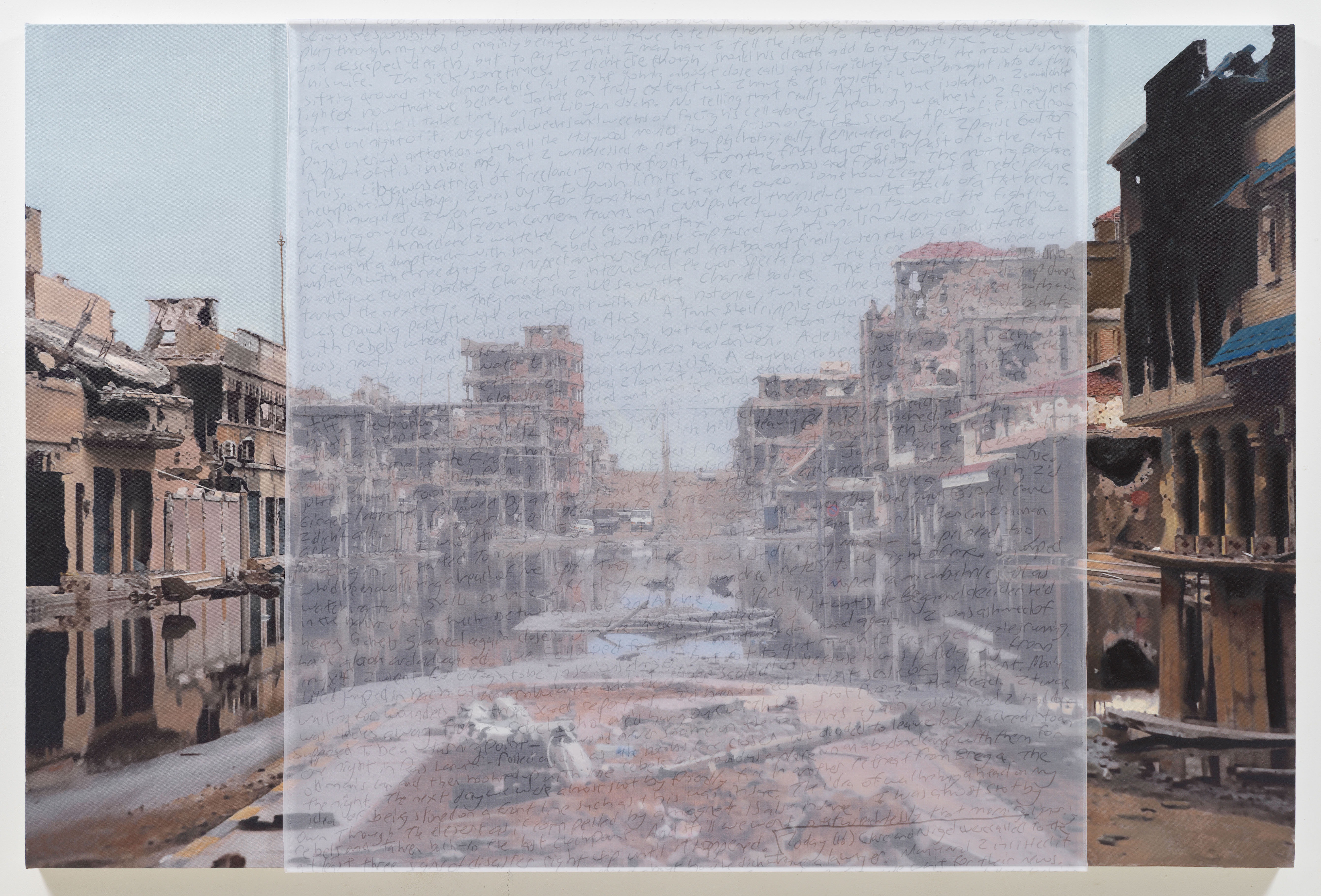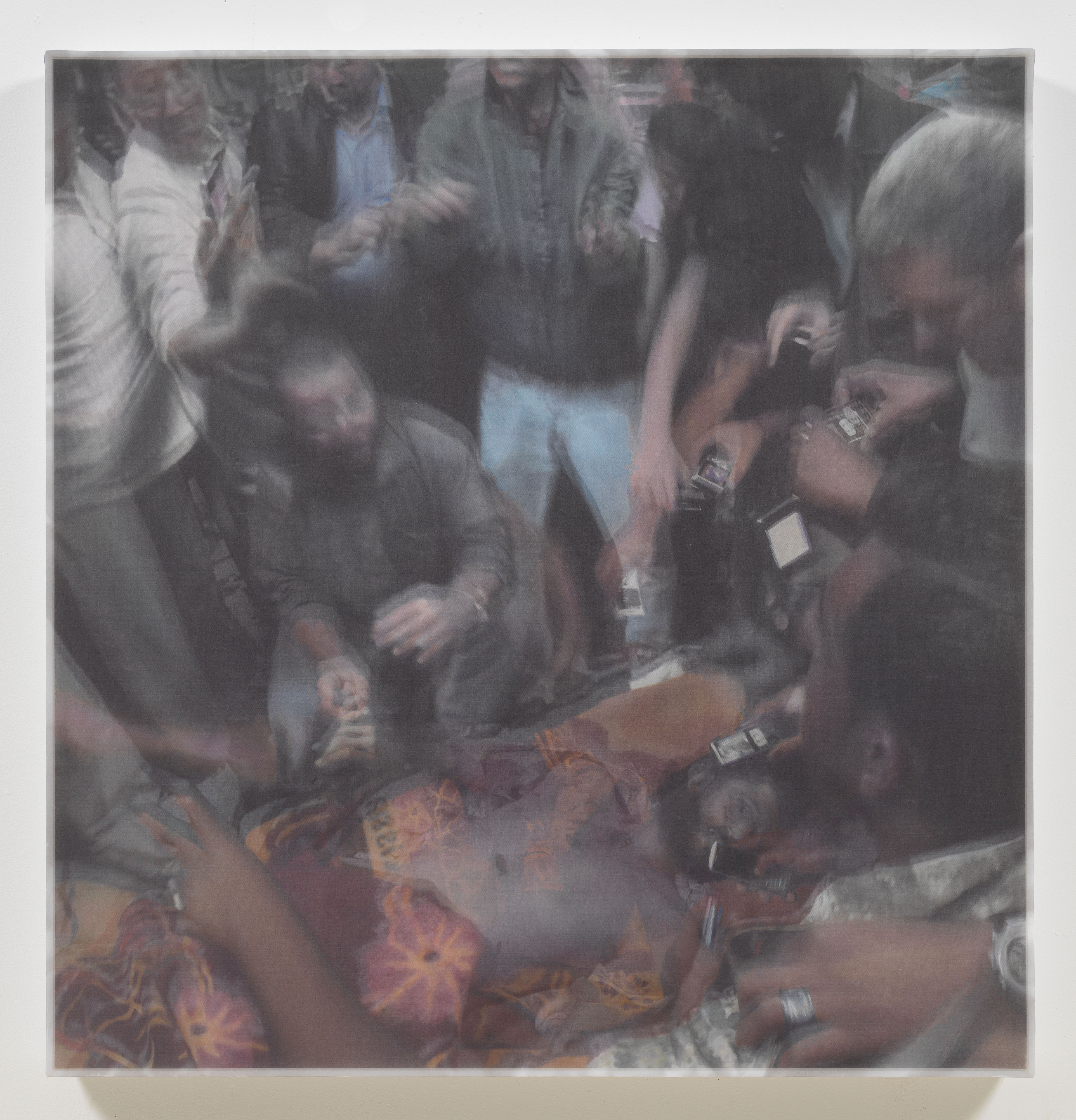 Early in the Libyan Arab Spring, the fighting was sporadic and chaotic. During one such violent incident, Foley recorded still photos and video of a field ambulance returning from the front with two casualties. In the AR video, the victims are bloody and you can hear Jim confirming if they are Benghazi civilians. The silk overlay captures two frames of this scene, diffusing the brutality of the moment and encapsulating the hectic, disorganized turmoil of the early fighting.