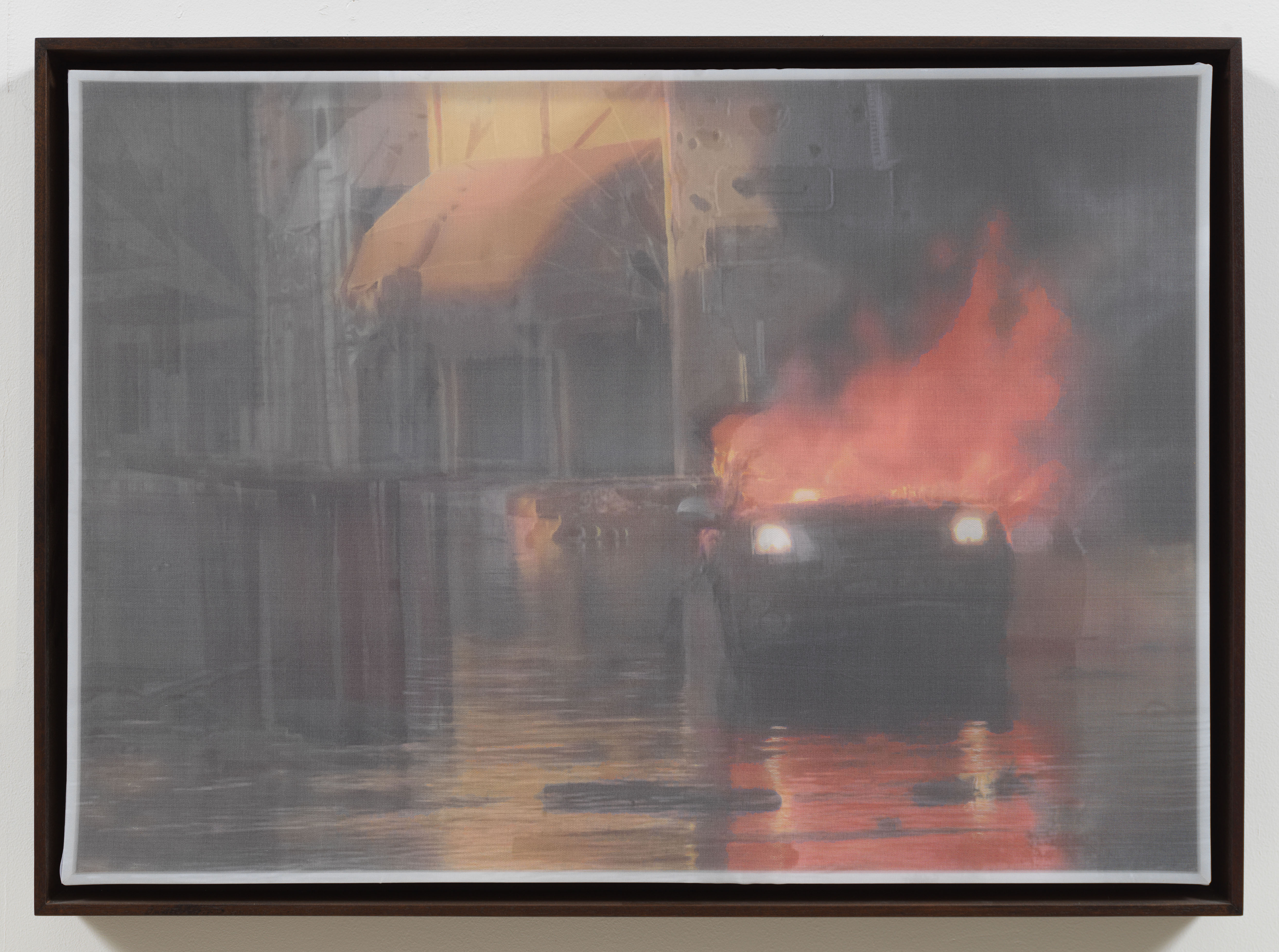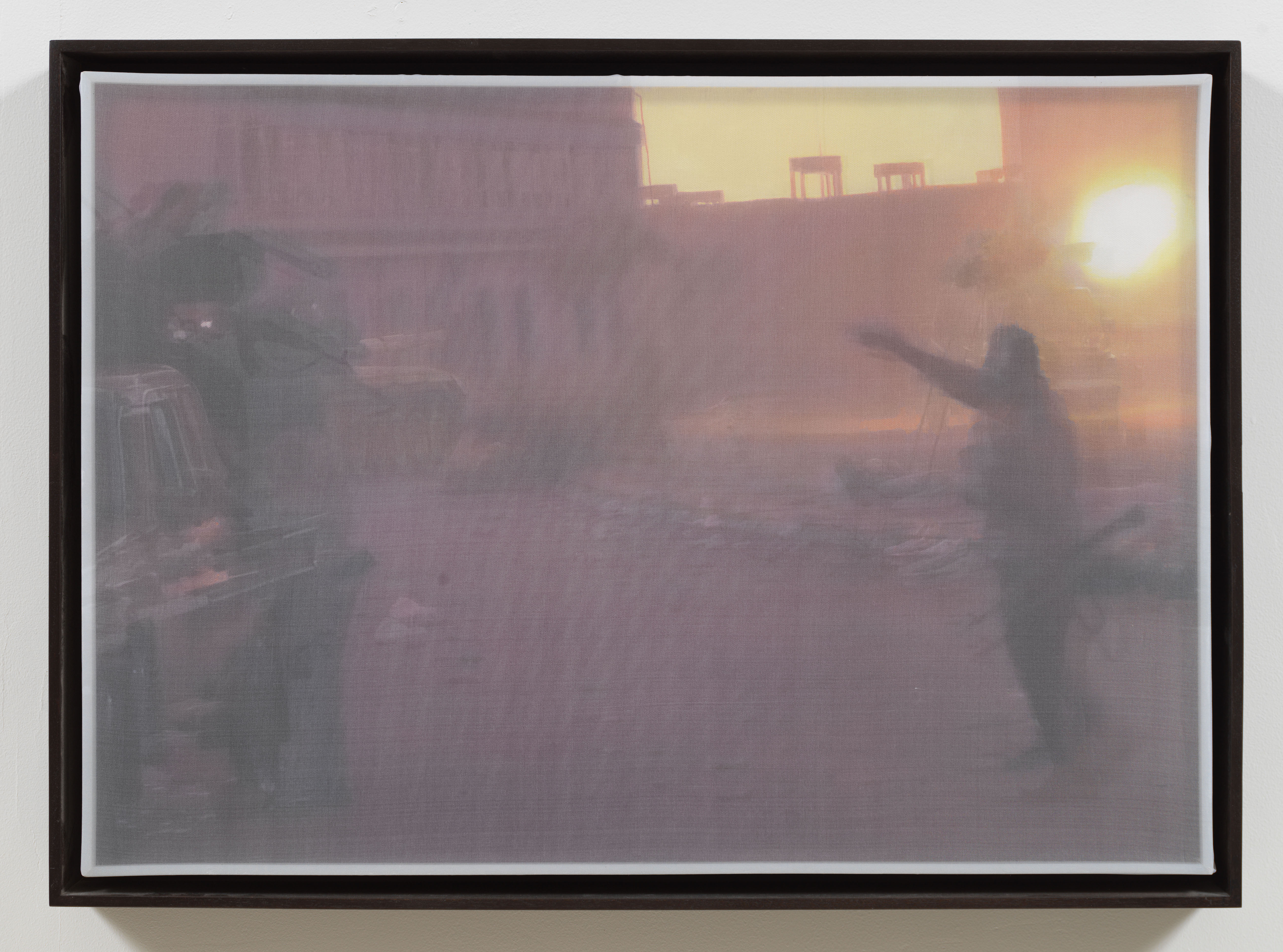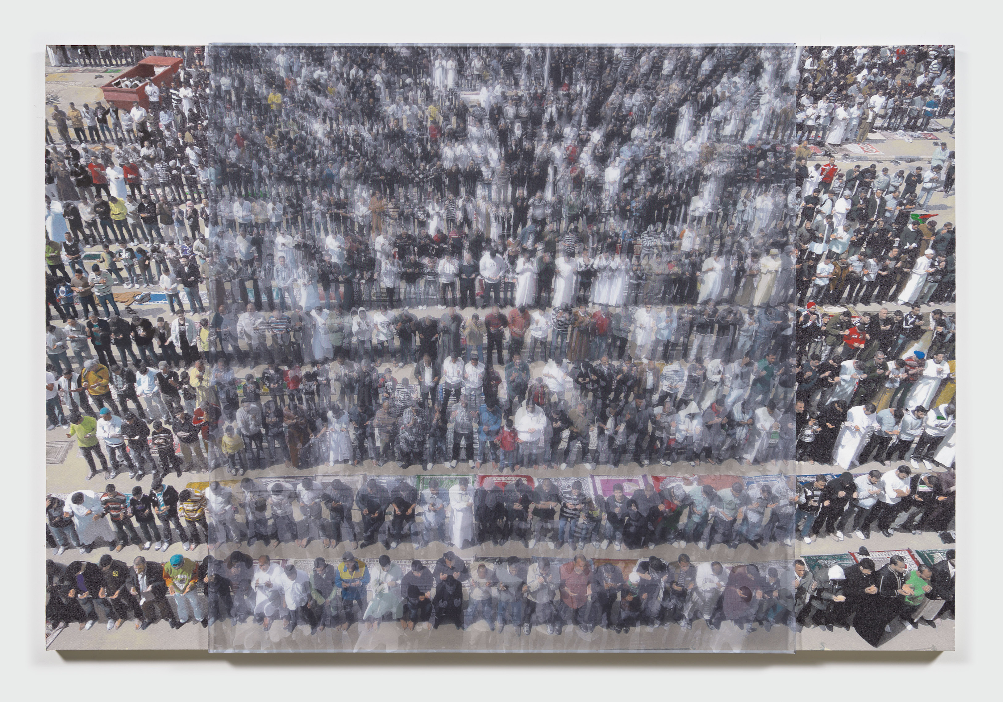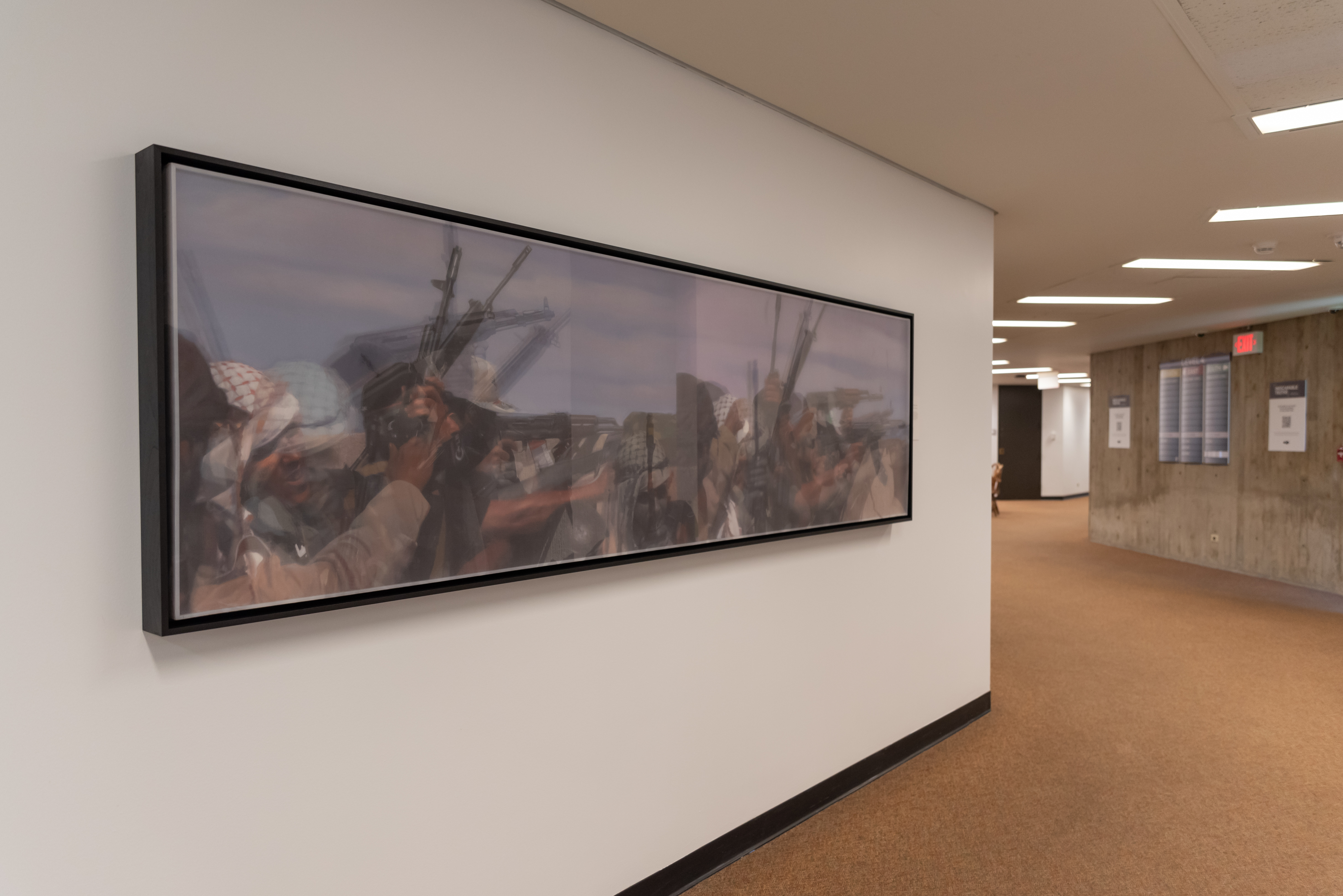 Early in the Libyan Arab Spring, the fighting was sporadic and chaotic. During one such violent incident, Foley recorded still photos and video of a field ambulance returning from the front with two casualties. In the AR video, the victims are bloody and you can hear Jim confirming if they are Benghazi civilians. The silk overlay captures two frames of this scene, diffusing the brutality of the moment and encapsulating the hectic, disorganized turmoil of the early fighting.