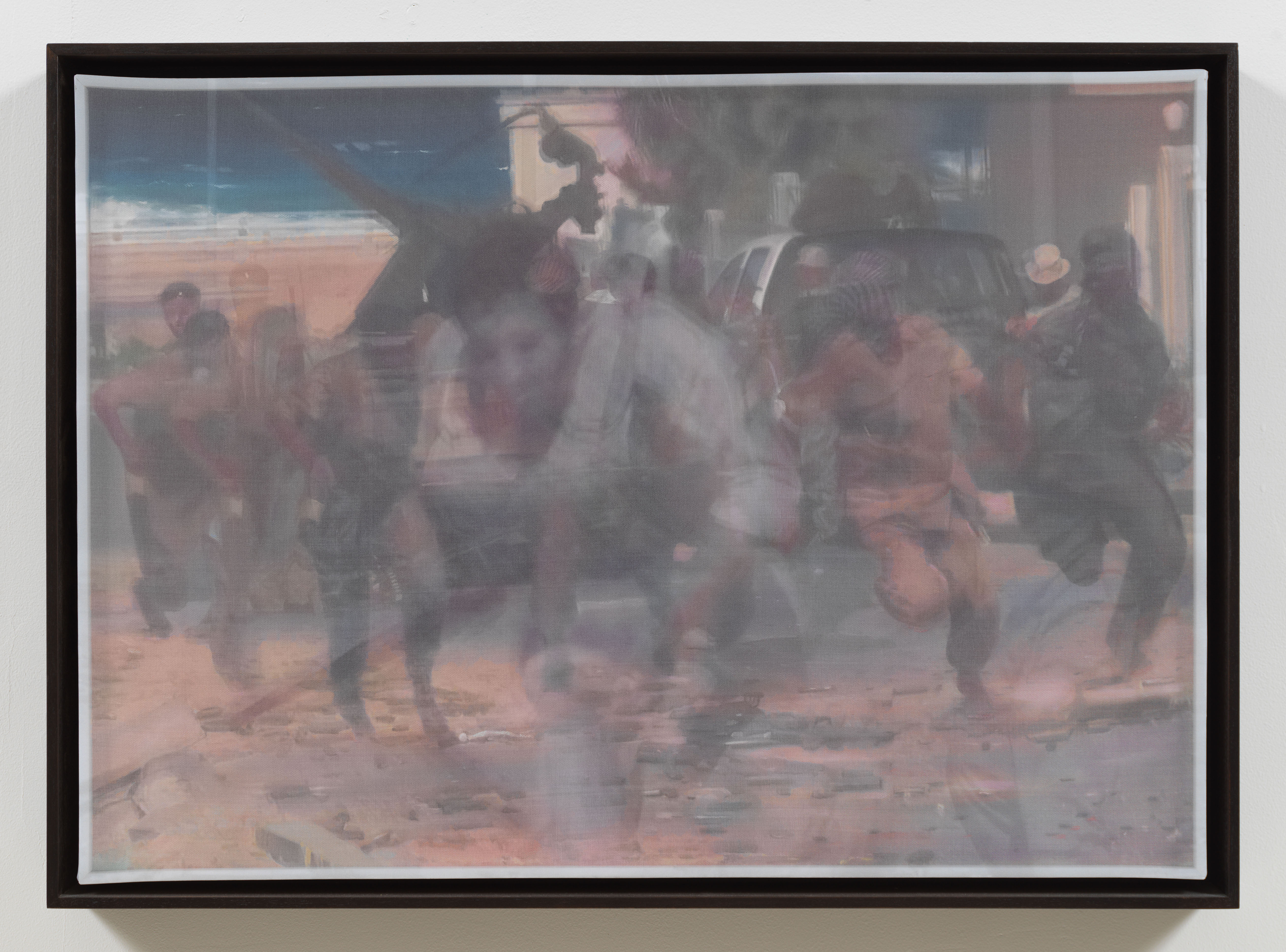 Inescapable Truths is about conflict, journalism, storytelling, humanity. McCallum uses oil painting and printing on silk to present a unique set of images that are simultaneously Foley’s and his own. The process is unmistakably McCallum’s; developed over years of making political art focused on re-centering stories of marginalization. His practice is one that highlights voices that are often ignored from within stories that we are so used to hearing. Because it takes effort to discern which part of the image is painted and which is printed, his paintings alter our perceptions and expectations. Some of the works seem to draw us in, while others seem to push us away. The experience is disorienting and engrossing all at once; it is hard to know where to look, and hard to look away.