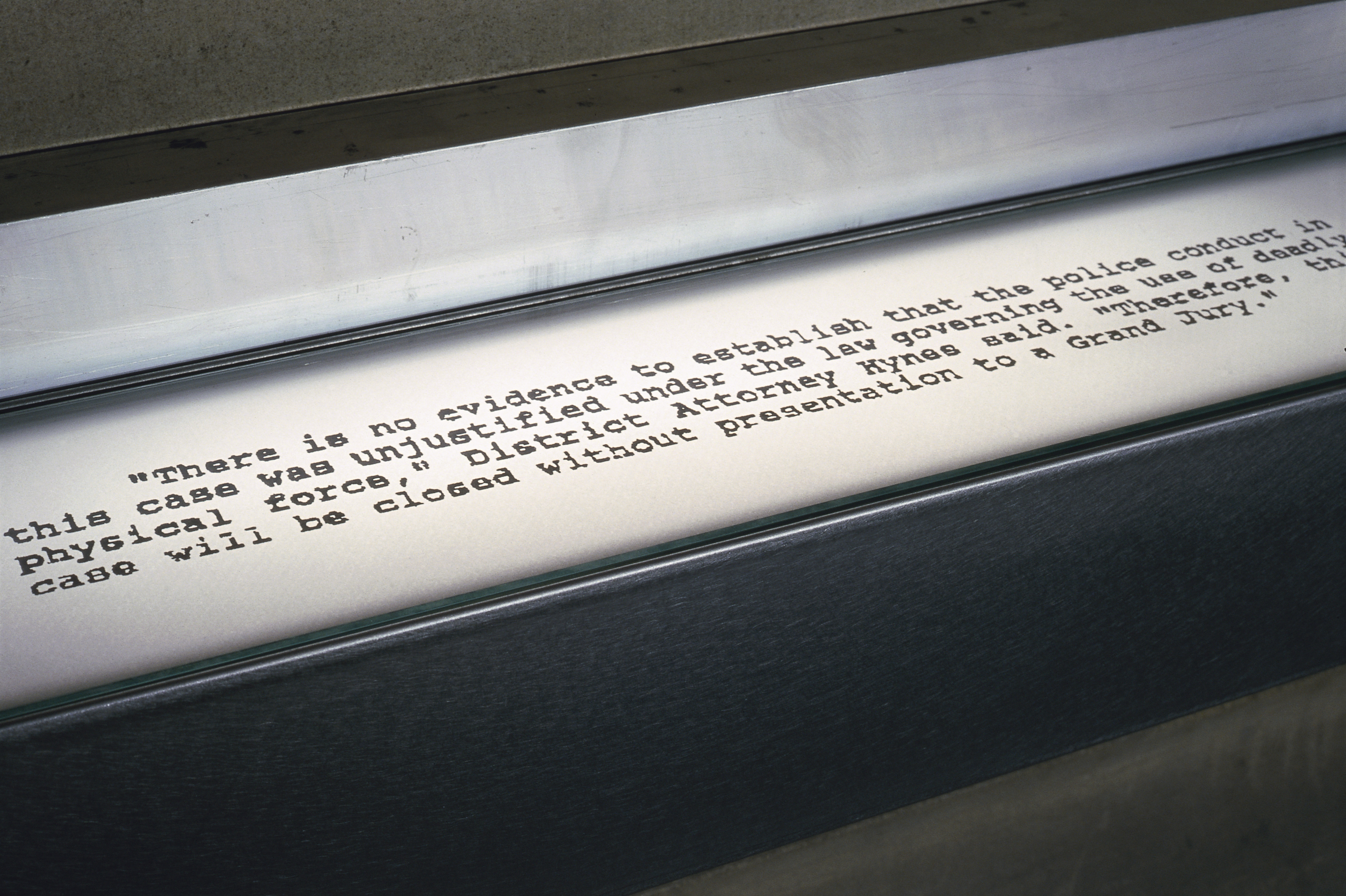 Witness- Perspectives on police violence, was a response to traumatic incidents taking place in New York City in the late 1990s. The installations are based on the perspectives of witnesses and survivors of police brutality, as well as family members, activists, police officers, court documents, autopsy reports, and criminal records.